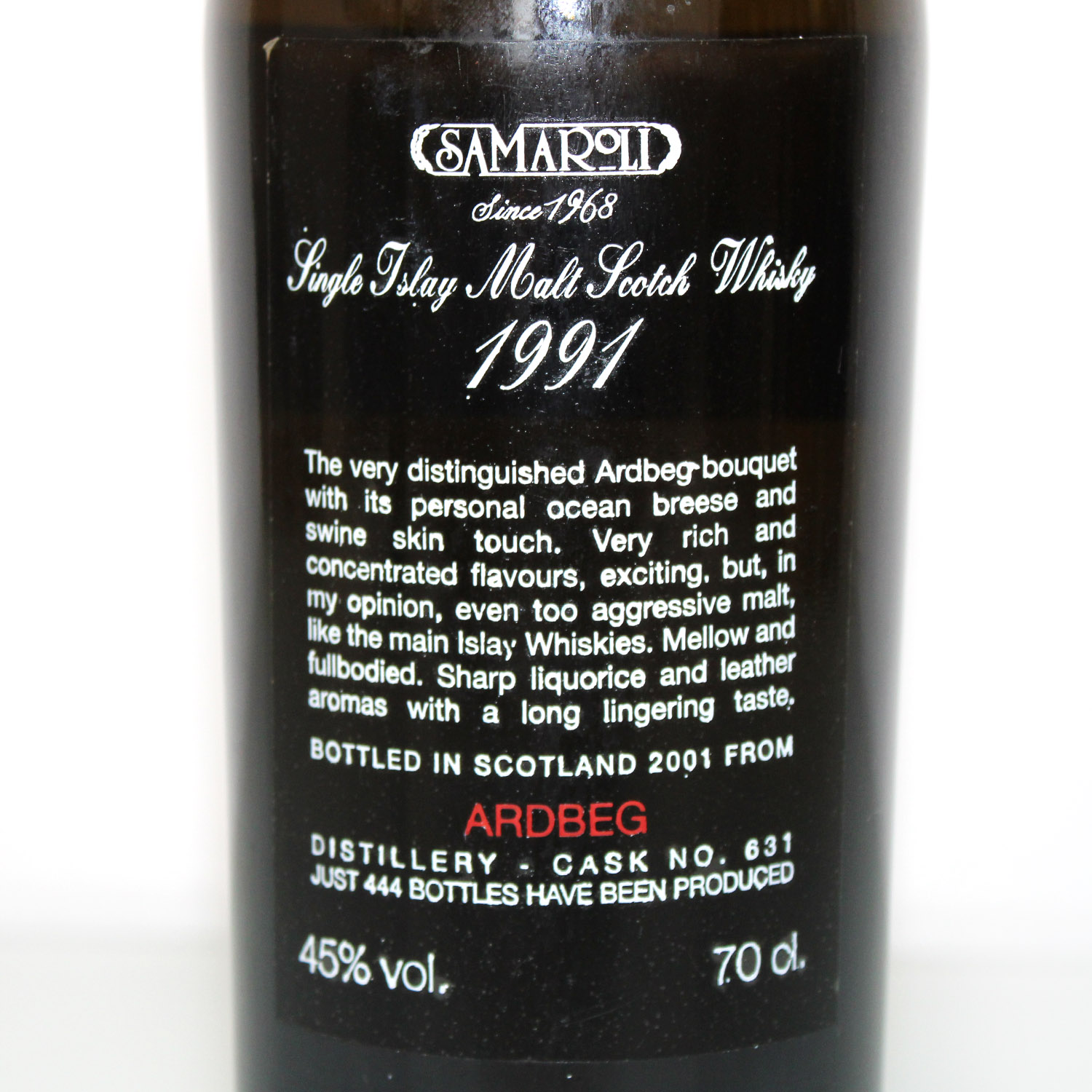 Ardbeg 1991 Samaroli 45% Bottled 2001 ist eine seltene Abfüllung aus der Hand des renommierten italienischen Independent Bottlers Silvano Samaroli. Destilliert im Jahr 1991 und zehn Jahre später abgefüllt, repräsentiert er eine Epoche von Ardbeg, die deutlich anders geprägt ist als die berühmten frühen 1970er-Jahrgänge, aber ebenfalls einen besonderen Platz bei Sammlern hat.