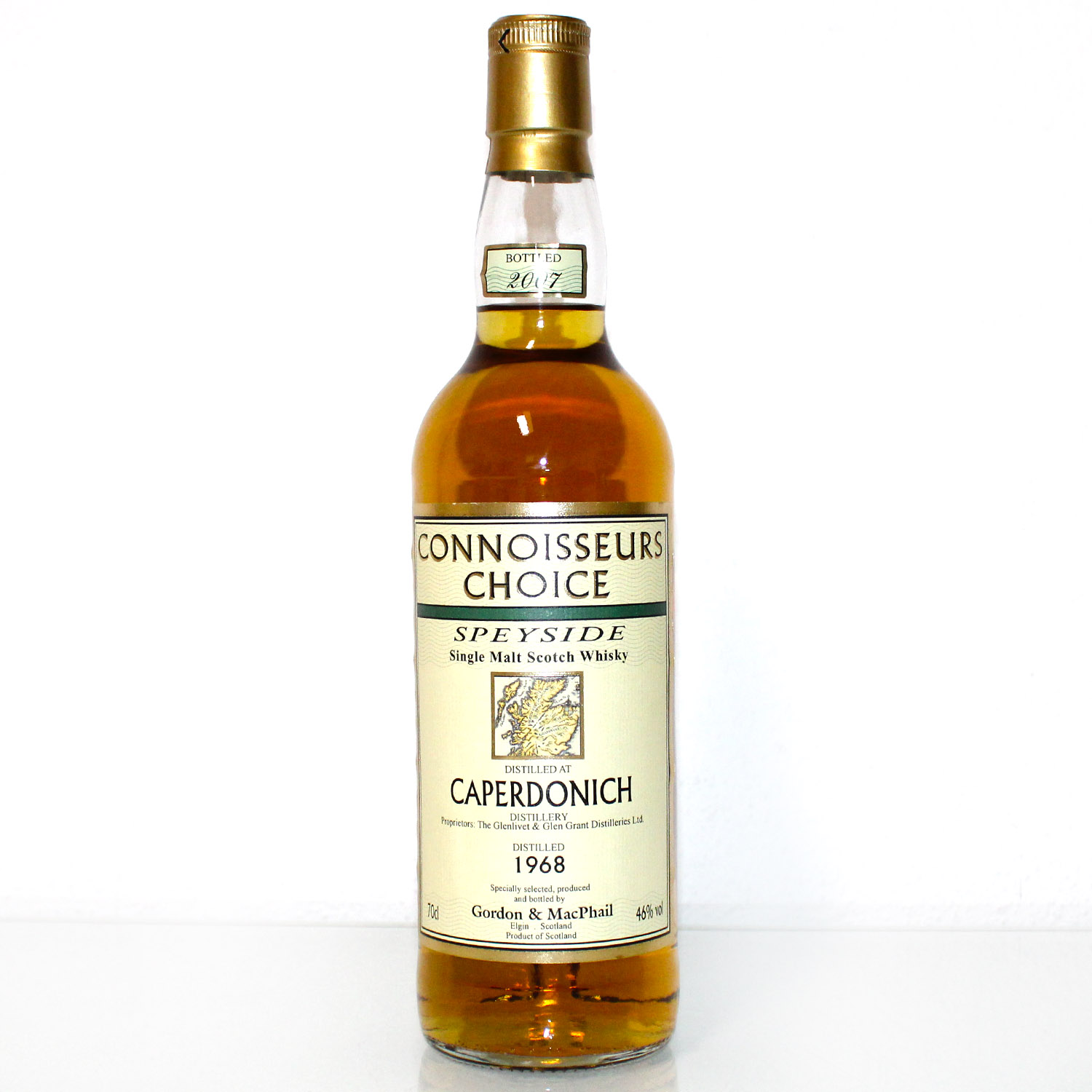 Caperdonich 1968 Connoisseurs Choice, abgefüllt 2007 von Gordon & MacPhail, ist eine seltene Vintage-Abfüllung aus der geschlossenen Caperdonich Distillery in der Speyside. Destilliert 1968 und nach fast vier Jahrzehnten Fassreifung abgefüllt, zeigt dieser Single Malt die klassische Eleganz und Tiefe, die für alte Caperdonich-Abfüllungen typisch ist. Gleichzeitig verkörpert er die handwerkliche Tradition der Connoisseurs-Choice-Reihe.
