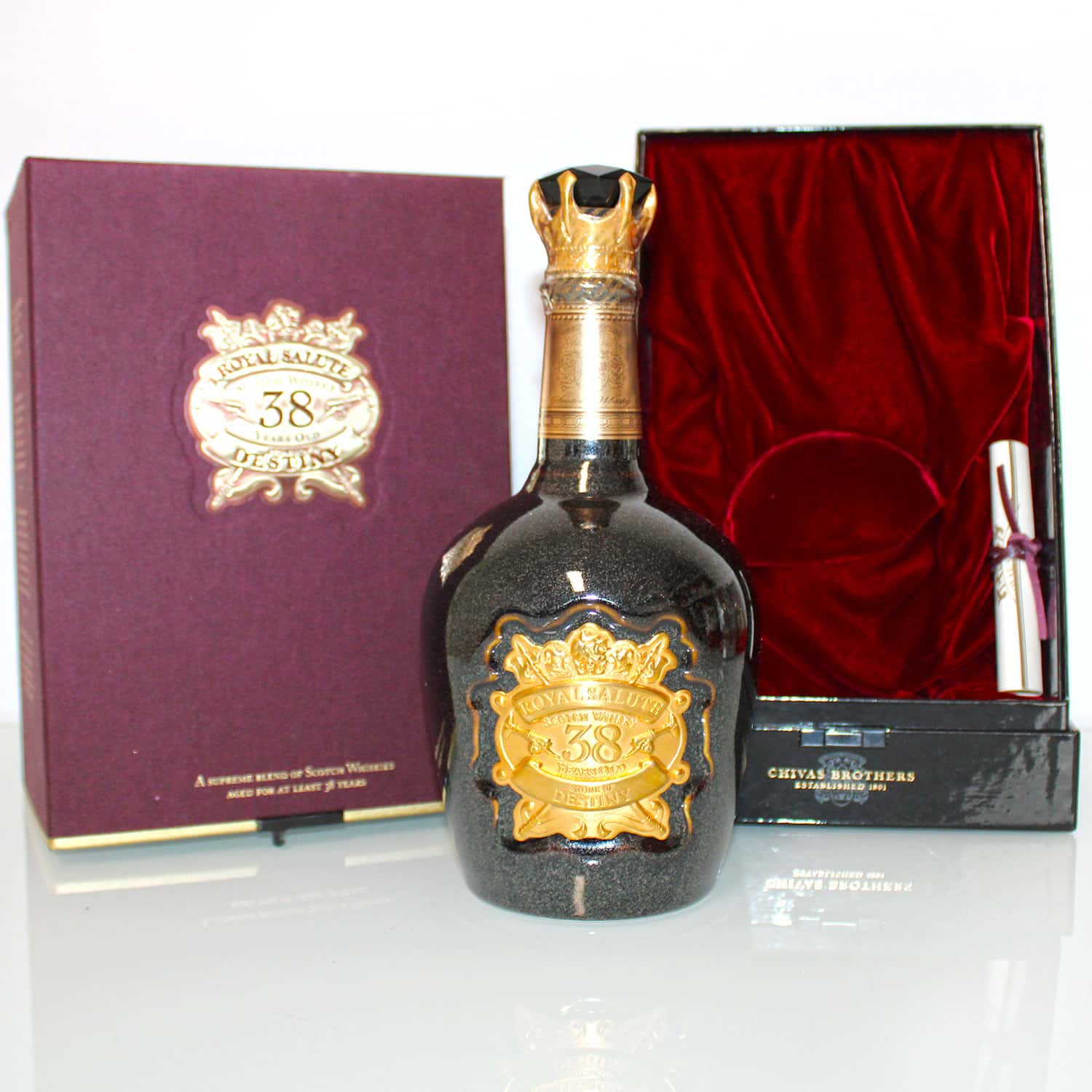 Chivas Royal Salute 38 Years Stone of Destiny ist ein außergewöhnlicher Blended Scotch Whisky, der zu den prestigeträchtigsten Abfüllungen des Hauses Chivas Brothers gehört. Mit 38 Jahren Reifezeit vereint er in seltener Vollendung Tiefe, Eleganz und Komplexität. In der Nase entfalten sich reiche Aromen von reifen Früchten, dunkler Schokolade und edlen Gewürzen, begleitet von einer feinen Holznote.