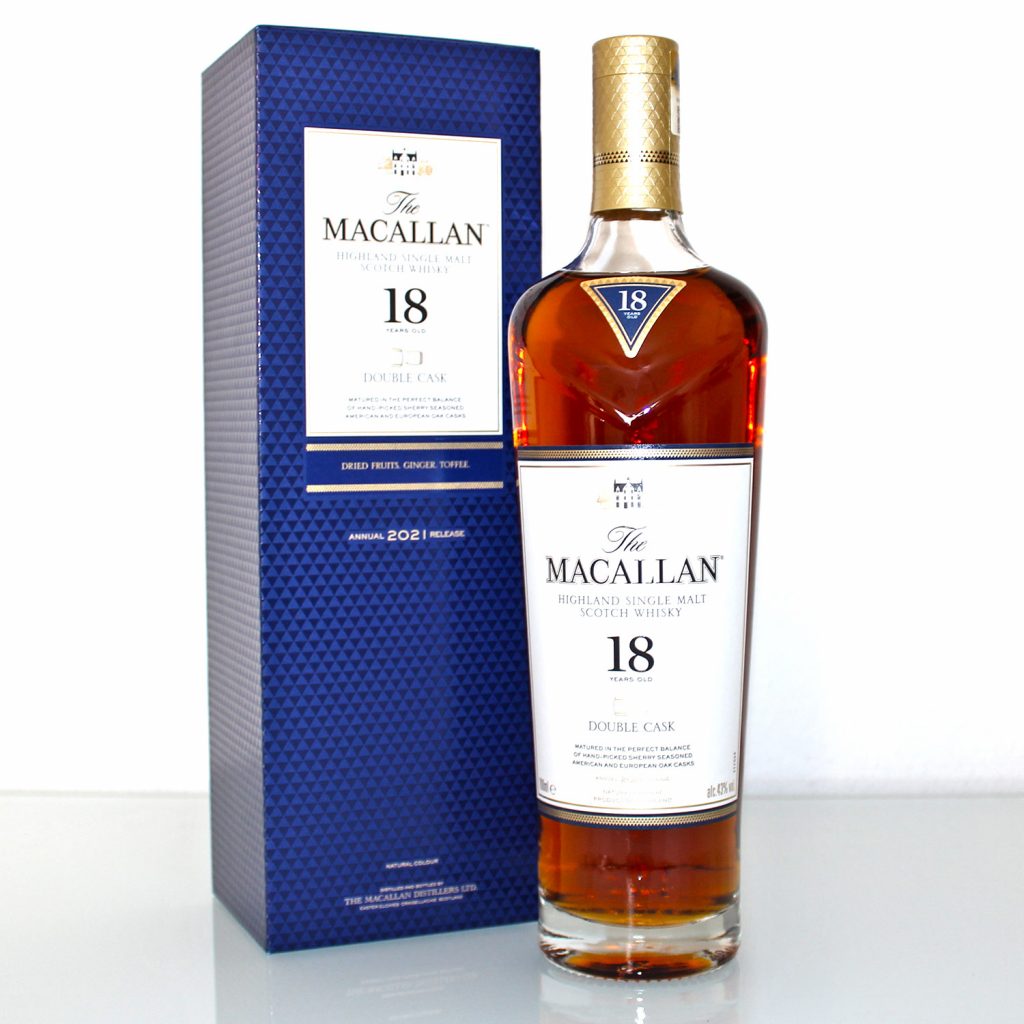 Macallan Annual 2021 Release 18 Years. Diese 18 Jahre alte Macallan 2021 Abfüllung reifte in amerikanischen und europäischen Sherry-Eichenfässern. Sie gehört zur Double Cask Reihe von Macallan.