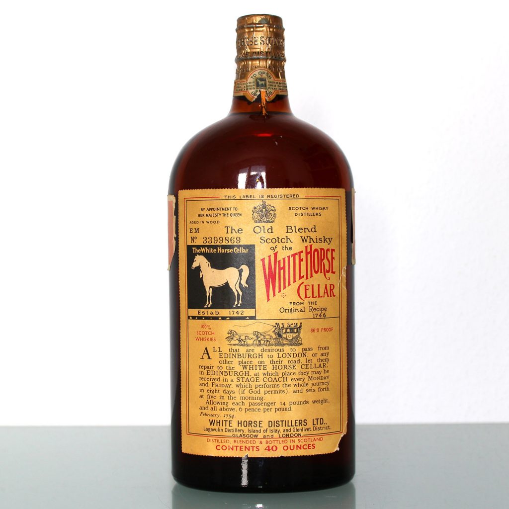 Ein seltener alter White Horse Cellar Whisky mit 40 Ounces (1,14 Liter) der in den 1950er Jahren abgefüllt wurde. Die alten White Horse Abfüllungen sind geschmacklich den aktuellen Lagavulin Abfüllungen an Intensität und Qualität deutlich überlegen. Eine echte Whisky-Legende und unter Sammlern sehr begehrt.